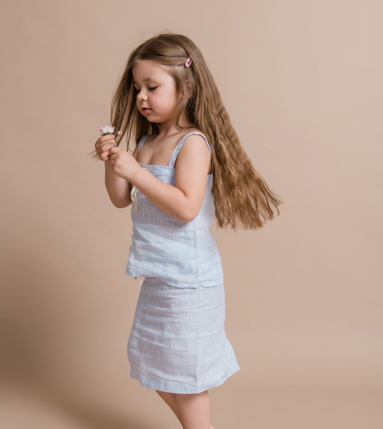 Svako je ljeto ispunjeno pričama. Svakodnevne stvari poput kamenčića ili naplavljenog drveta u tren oka postanu dvorci i zmajevi. U ovoj lepršavoj suknji ukrašenoj sa slatkom mašnicom vaša će djevojčica uživati u šetnji, izmišljajući nove priče. Nakon dugog razigranog poslijepodneva na plaži ili u vrtu, ova svestrana suknja odlična je za šetnju gradom uz sladoled. Suknja ima izdržljiv pojas i idealno se kombinira s Novella topom bez rukava.