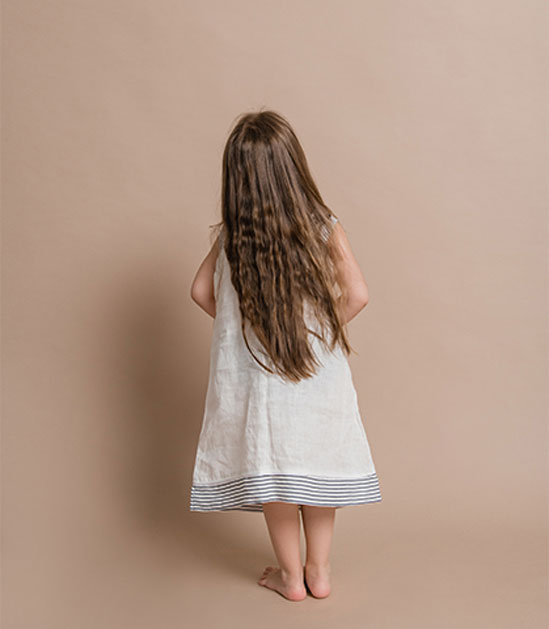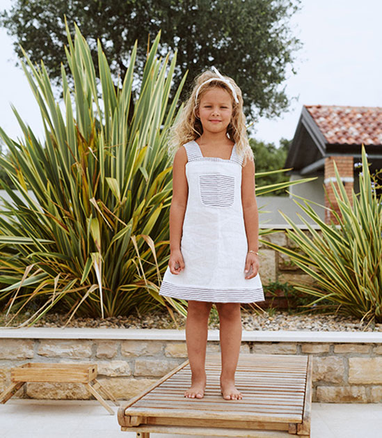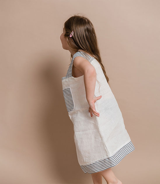 Male istraživačice vole juriti naokolo, a opet izgledati stylish. Odaberite ovu haljinu bez rukava za ljetne igre i zabave. Dok odrasli razgovaraju i uživaju u hrani i piću, mali će se istraživači igrati u vrtu i stvarati nove uspomene. Haljina ima široke naramenice, prednji džep i porub ukrašen tankim tamnosivim prugama.